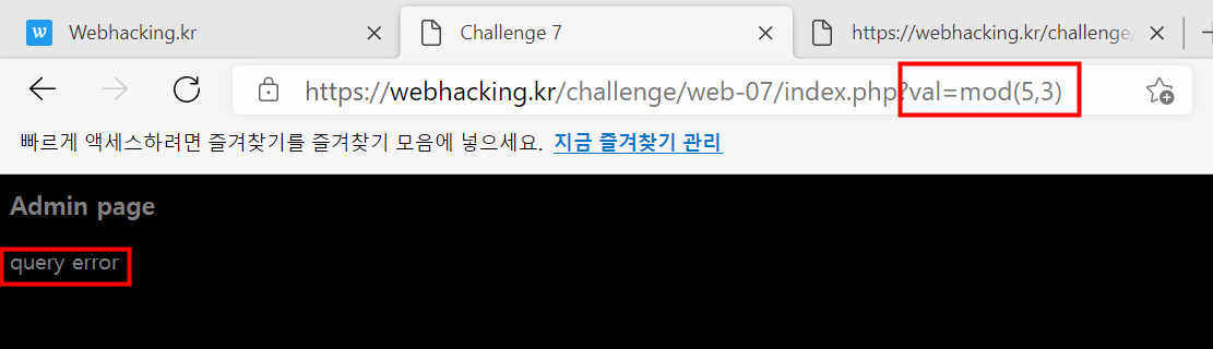 (, )는 필터링 되어 있지 않으므로 mod함수(나머지를 구하는 함수)를 사용하여 2를 만들기로 하였습니다.