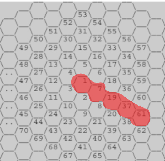 이를 정리하면 벌집 중앙 1번 방에서 x번 거쳐 지나서 갈 수 있는 최대의 방 번호는 Cx = Cx-1 + 6 * (x - 1)이 됩니다.